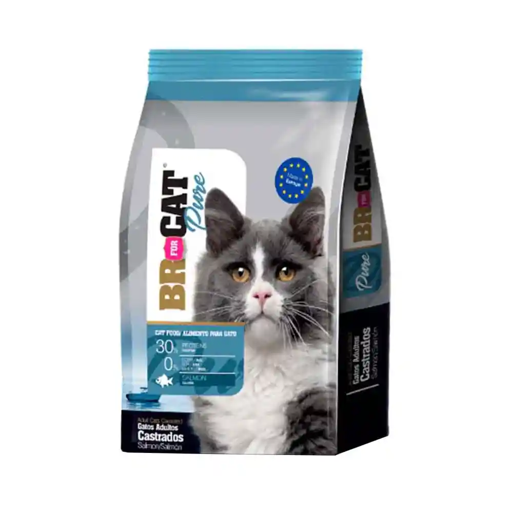 El alimento BR For Cat Pure Castrated Cats Salmon 1 kg es una fórmula premium completa especialmente diseñada para gatos adultos castrados de todas las razas, elaborada con salmón como fuente principal de proteína de alta calidad que aporta aminoácidos esenciales, favorece el mantenimiento de la masa muscular y promueve una piel sana y pelaje brillante gracias a sus ácidos grasos omega 3 y 6; su contenido moderado de grasa y calorías ayuda a controlar el peso, mientras que su balance de minerales contribuye a la salud urinaria, incluyendo además fibra para mejorar la digestión y prebióticos que favorecen la flora intestinal, con una composición nutricional aproximada de 30% de proteína, 10% de grasa, hasta 5% de fibra, 8.5% de cenizas y 9% de humedad, enriquecido con vitaminas (A, D3, E), taurina y L-carnitina para un soporte integral del metabolismo y sistema inmune
