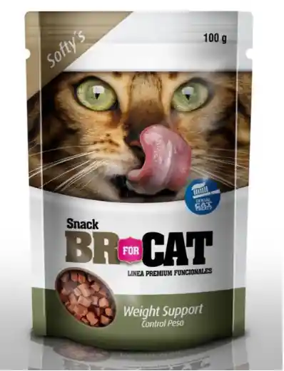 Br For Cat Softy Control Peso es un suplemento alimenticio para gatos de todas las razas y tamaños desde los 6 meses de edad en adelante. Presentación 100g, 350g. Recomendación Debe conservarse en lugar seco, fresco y ventilado, lejos del alcance de rayos solares directos. Durante el uso mantener el envase cerrado. Consumir en el máximo 30 días después de abrir el empaque. Composición Harina de Maíz, Harina de Trigo, Glicerina, Lecitina, Grasa de pollo, Agua, Harina de pollo, Harina de salmón, Colorantes (óxido de hierro rojo), Butilhidroxitolueno (BHT), Sorbato de potasio, Saborizantes a carne, Saborizante a pescado, Ácido fosfórico, Premezcla vitamínica (vitamina E, vitamina C, L-camitina, Taurina), Harina de huevo e Hígado de pollo hidrolizado.