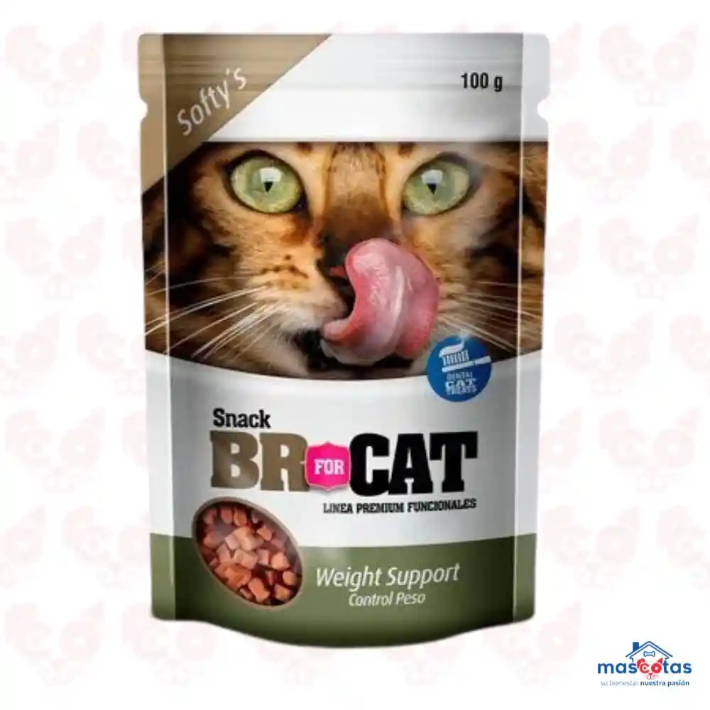 Br For Cat Softy Control Peso es un suplemento alimenticio para gatos de todas las razas y tamaños desde los 6 meses de edad en adelante. Presentación 100g, 350g. Recomendación Debe conservarse en lugar seco, fresco y ventilado, lejos del alcance de rayos solares directos. Durante el uso mantener el envase cerrado. Consumir en el máximo 30 días después de abrir el empaque. Composición Harina de Maíz, Harina de Trigo, Glicerina, Lecitina, Grasa de pollo, Agua, Harina de pollo, Harina de salmón, Colorantes (óxido de hierro rojo), Butilhidroxitolueno (BHT), Sorbato de potasio, Saborizantes a carne, Saborizante a pescado, Ácido fosfórico, Premezcla vitamínica (vitamina E, vitamina C, L-camitina, Taurina), Harina de huevo e Hígado de pollo hidrolizado.