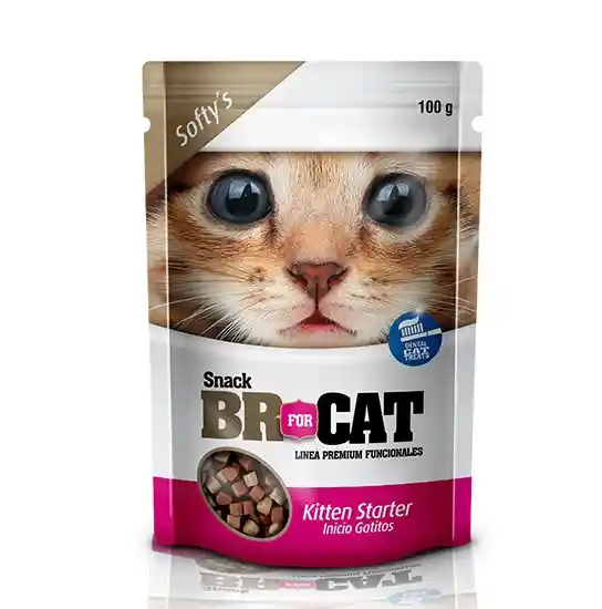 Br For Cat Softy Inicio Gatitos es un suplemento alimenticio para gatos de todas las razas y tamaños hasta los 6 meses de edad. composición Harina de Maíz, Harina de Trigo, Glicerina, Lecitina, Grasa de pollo, Agua, Harina de pollo, Harina de salmón, Colorantes (óxido de hierro rojo), Butilhidroxitolueno (BHT), Sorbato de potasio, Saborizantes a carne, Saborizante a pescado, Ácido fosfórico, Premezcla vitamínica (vitamina E, vitamina C, L-camitina, Taurina), Harina de huevo e Hígado de pollo hidrolizado.
