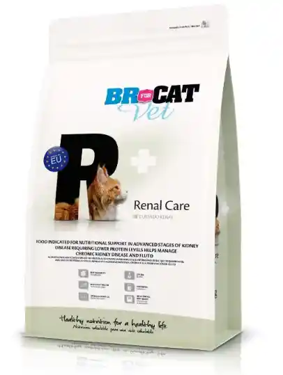 El alimento BR For Cat Vet Renal Care está formulado para gatos con insuficiencia renal crónica o que requieren apoyo nutricional para mantener la función de los riñones. Contiene proteínas seleccionadas de alta calidad en cantidad controlada, provenientes de pollo deshidratado e hidrolizado, que facilitan la digestión y reducen la carga de trabajo renal. Su fórmula incluye grasas de pollo y aceite de pescado, fuentes de energía fácilmente asimilables y ricas en ácidos grasos omega 3, que contribuyen a proteger la función renal y cardiovascular. Además, está enriquecido con arroz y fibras vegetales que mejoran la digestibilidad y la salud intestinal. Su balance mineral cuidadosamente ajustado —con niveles reducidos de fósforo y sodio— ayuda a disminuir la progresión de la enfermedad renal. Contiene taurina, L-carnitina, antioxidantes (vitaminas E y C) y minerales como zinc y selenio, que apoyan la función inmunológica y reducen el estrés oxidativo. En conjunto, esta fórmula favorece el bienestar general del gato, mejora su vitalidad y contribuye a mantener una función renal estable.