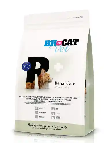 El alimento BR For Cat Vet Renal Care está formulado para gatos con insuficiencia renal crónica o que requieren apoyo nutricional para mantener la función de los riñones. Contiene proteínas seleccionadas de alta calidad en cantidad controlada, provenientes de pollo deshidratado e hidrolizado, que facilitan la digestión y reducen la carga de trabajo renal. Su fórmula incluye grasas de pollo y aceite de pescado, fuentes de energía fácilmente asimilables y ricas en ácidos grasos omega 3, que contribuyen a proteger la función renal y cardiovascular. Además, está enriquecido con arroz y fibras vegetales que mejoran la digestibilidad y la salud intestinal. Su balance mineral cuidadosamente ajustado —con niveles reducidos de fósforo y sodio— ayuda a disminuir la progresión de la enfermedad renal. Contiene taurina, L-carnitina, antioxidantes (vitaminas E y C) y minerales como zinc y selenio, que apoyan la función inmunológica y reducen el estrés oxidativo. En conjunto, esta fórmula favorece el bienestar general del gato, mejora su vitalidad y contribuye a mantener una función renal estable.