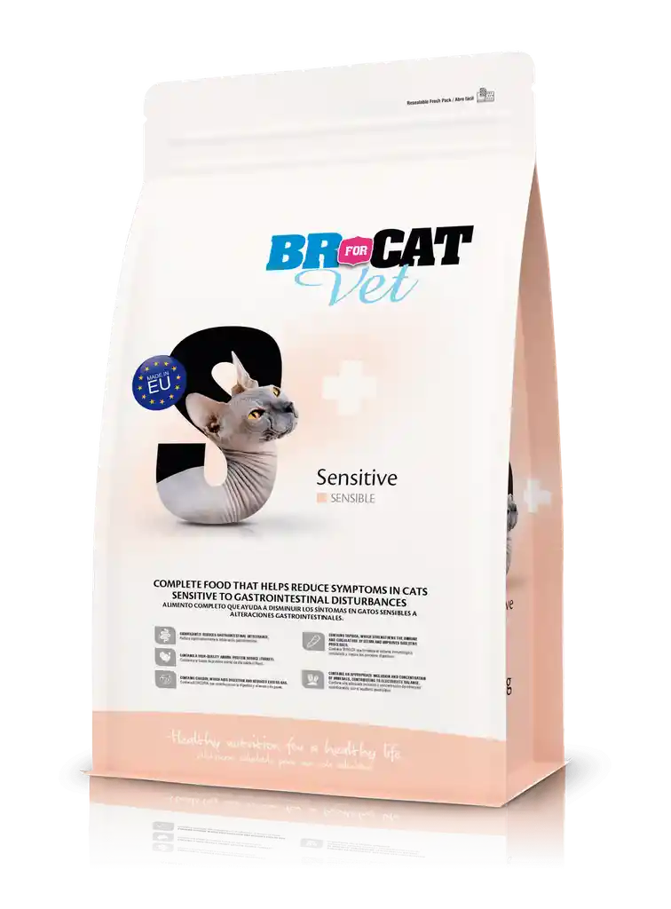 ¿Tu gato presenta sensibilidad digestiva o molestias gastrointestinales frecuentes? BR for Cat Vet Sensitive es un alimento completo e hipoalergénico, formulado para ayudar a reducir los síntomas en gatos con sensibilidad digestiva. Especialmente diseñado para felinos con trastornos gastrointestinales, BR for Cat Vet Sensitive ofrece una nutrición equilibrada y fácil de digerir. Su fórmula hipoalergénica ayuda a aliviar las molestias y a mantener la salud intestinal de tu gato día a día.