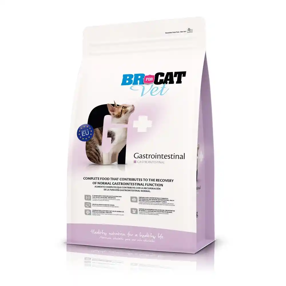 BR For Cat Veterinary Gastrointestinal es un alimento formulado especialmente para gatos con trastornos digestivos o sensibilidad gastrointestinal, diseñado para apoyar el funcionamiento adecuado del sistema digestivo y favorecer la recuperación nutricional. Su fórmula incorpora proteínas de alta digestibilidad y fuentes de energía fácilmente asimilables, ayudando a reducir la carga digestiva y mejorar la absorción de nutrientes. Este alimento de la línea BR For Cat Veterinary contiene fibras funcionales y prebióticos que contribuyen a equilibrar la microbiota intestinal, ayudando a mejorar la calidad de las heces y el confort digestivo del gato. Además, incluye vitaminas, minerales y antioxidantes que apoyan el sistema inmunológico durante periodos de alteraciones gastrointestinales. Su formulación está pensada para gatos que presentan diarreas, gastritis, colitis o procesos digestivos sensibles, proporcionando un soporte nutricional adecuado durante la recuperación. Se recomienda su uso bajo orientación veterinaria para garantizar el manejo adecuado de la condición digestiva.