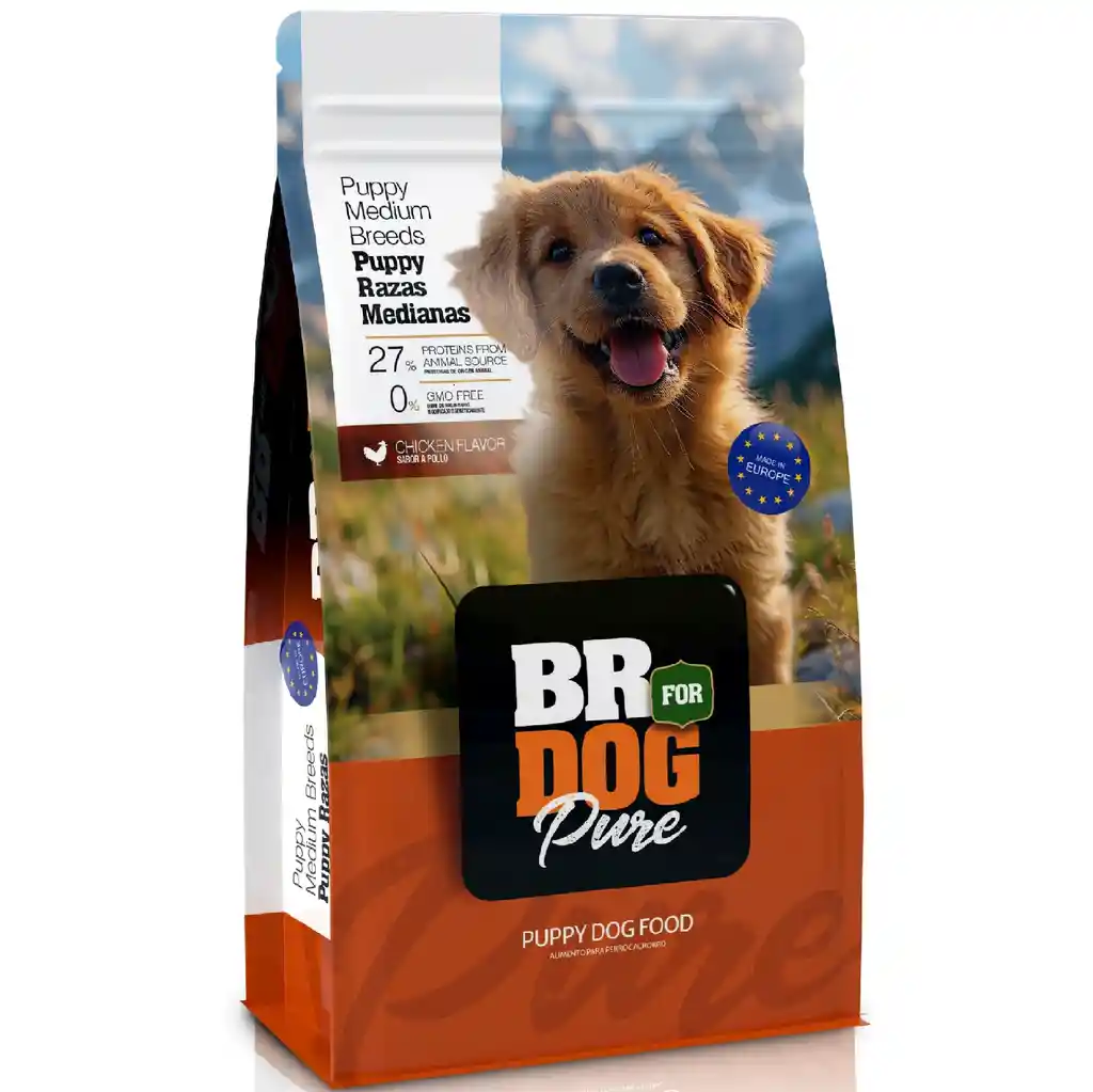 BR For Dog Pure Puppy Razas Medianas. es un alimento seco, completo diseñado para perros cachorros de razas medianas desde los 2 hasta los 12 meses de edad. Pollo deshidratad, arroz, harina de ave, grasa animal (pollo), proteína de pollo hidrolizada, pulpa de remolacha, semilla de lino, vitaminas y minerales, huevo seco entero, aceite de salmón, harina de pescado, levadura de cerveza seca, extracto de romero, extracto de semilla de uva, extracto de cúrcuma, extracto de silimarina, aceite de pomelo expresado, aceite de hoja de clavo.