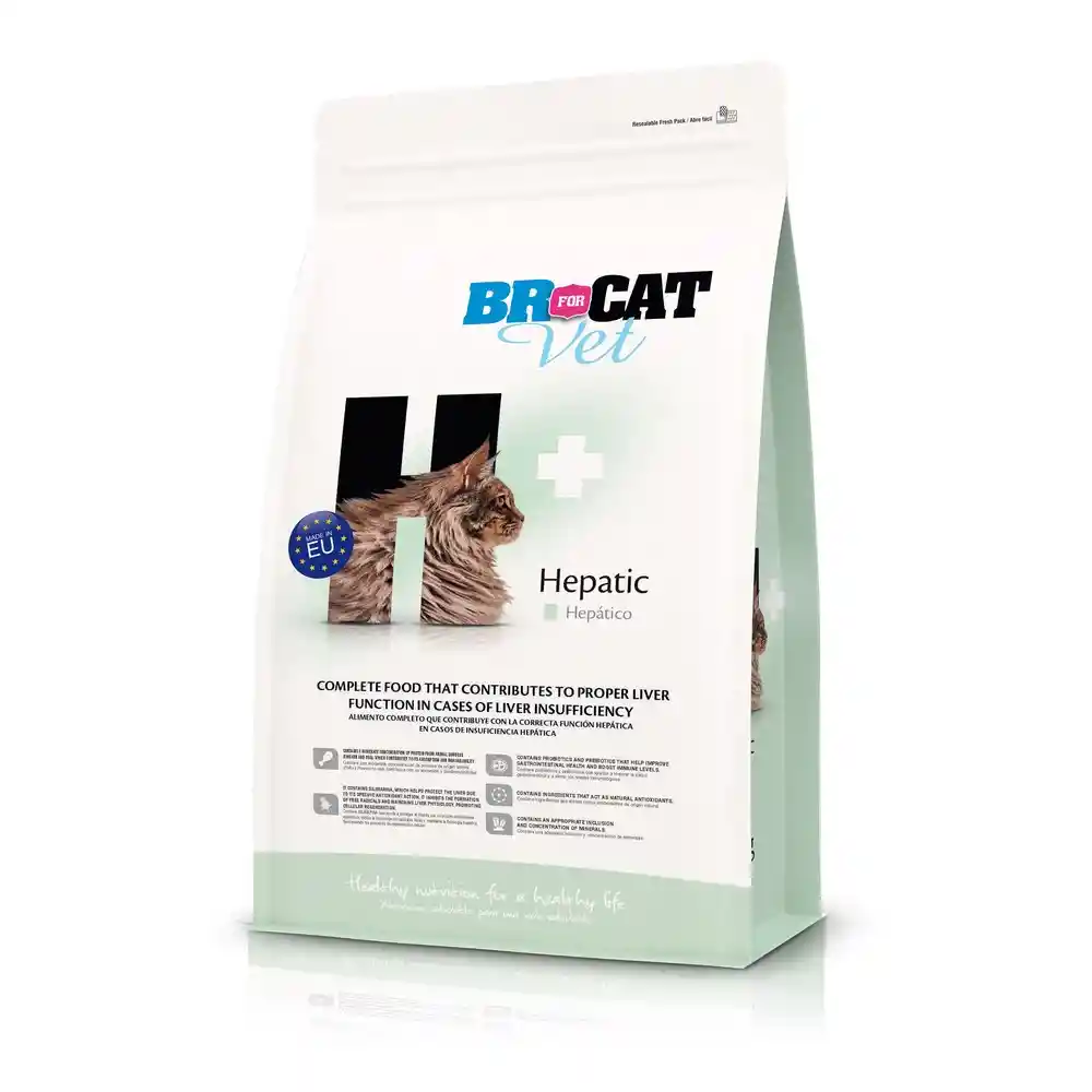 BR For Cat Veterinary Hepático es un alimento formulado para gatos con enfermedades o alteraciones del hígado, diseñado para apoyar la función hepática mediante una nutrición cuidadosamente balanceada. Su fórmula incorpora proteínas de alta digestibilidad y niveles controlados de ciertos minerales, ayudando a reducir la carga metabólica que el hígado debe procesar. Este alimento de la línea BR For Cat Veterinary incluye nutrientes funcionales como antioxidantes, vitaminas y ácidos grasos esenciales que contribuyen a proteger las células hepáticas y apoyar el metabolismo del organismo. Además, su formulación ayuda a mejorar la digestión y la absorción de nutrientes en gatos que presentan compromiso hepático. Está indicado como apoyo nutricional en enfermedades hepáticas, contribuyendo a mejorar la calidad de vida del gato mientras se maneja la condición bajo control veterinario.