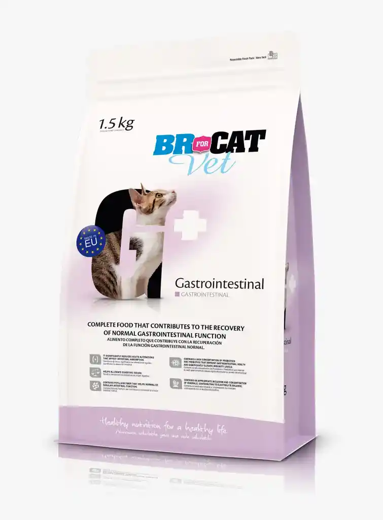 BR FOR CAT VET GASTROINTESTINAL es un alimento completo para suministrar a gatos adultos de todas las razas para recuperar la función gastrointestinal normal.