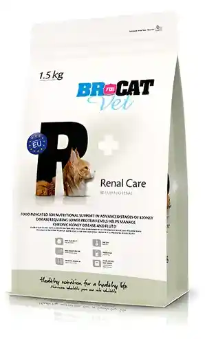 El alimento BR For Cat Vet Renal Care en presentación de 1.5 Kg es una dieta veterinaria medicada, específicamente formulada para gatos adultos con enfermedad renal crónica (ERC) o que requieren soporte para la función renal. Características y Beneficios Principales Soporte Renal: Ayuda a mantener la función renal, reduciendo la carga de trabajo en los riñones debilitados. Niveles Controlados de Nutrientes: Formulado con bajo contenido de fósforo y proteína moderada de alta calidad para minimizar las complicaciones de la enfermedad renal y evitar la sobrecarga renal. Ácidos Grasos Esenciales: Enriquecido con ácidos grasos Omega 3 (EPA y DHA) provenientes del aceite de algas, que tienen efectos antiinflamatorios y ayudan a proteger la función renal y cardiovascular. Alta Palatabilidad: Diseñado con un sabor agradable para estimular el apetito de los gatos, que a menudo se reduce en casos de enfermedad renal. Antioxidantes: Contiene un complejo de antioxidantes (como las vitaminas E y C) que combaten el daño celular y fortalecen el sistema inmunológico. Salud Digestiva: Incluye fibras solubles, prebióticos (FOS y MOS) y arroz que mejoran la digestión y la absorción de nutrientes.