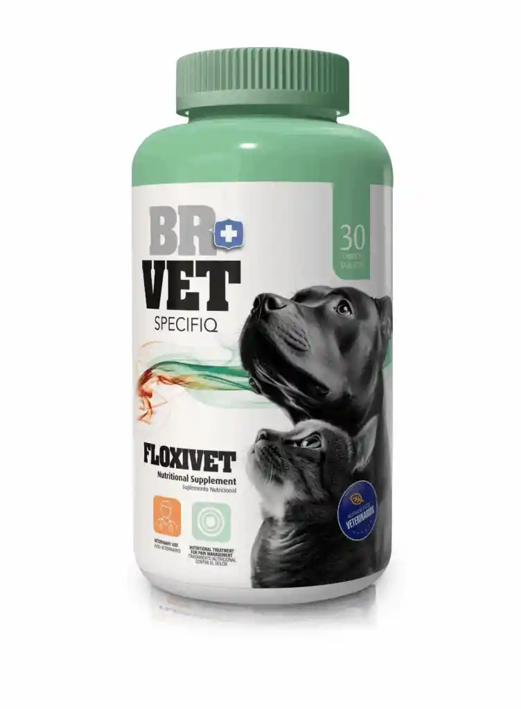 BRVet – FLOXIVET Suplemento alimenticio en tabletas indicado como tratamiento natural para el dolor del aparato osteomuscular. Frasco x 30 Tabletas Sabor a Vainilla COMPOSICION ACTIVA (Por tableta de 1520 mg): Condroitina sulfato: 466 mg. Complejo B: Tiamina (50 mg), Piridoxina (75 mg). Cianocobalamina (5 mg). Minerales: Sulfato ferroso (3 mg), Sulfato de zinc (0,3 mg), Sulfato de manganeso (0,7 mg). Extractos naturales: Árnica montana, Mercurius solubilis, Hepar sulfuris Excipientes y saborizantes palatables. Osteoartritis, displasia de cadera/codo, espondiloartrosis. Dolor musculoesquelético crónico o agudo (coadyuvante). Recuperación post-quirúrgica en ortopedia. Soporte en animales geriátricos con pérdida de movilidad. Déficits nutricionales asociados a vitaminas delcomplejo B.Osteoartritis, displasia de cadera/codo, espondiloartrosis. Dolor musculoesquelético crónico o agudo (coadyuvante). Recuperación post-quirúrgica en ortopedia. Soporte en animales geriátricos con pérdida de movilidad. Déficits nutricionales asociados a vitaminas del complejo B. Indicaciones Osteoartritis, displasia de cadera/codo, espondiloartrosis. Dolor musculoesquelético crónico o agudo (coadyuvante). Recuperación post-quirúrgica en ortopedia. Soporte en animales geriátricos con pérdida de movilidad. Déficits nutricionales asociados a vitaminas del complejo B