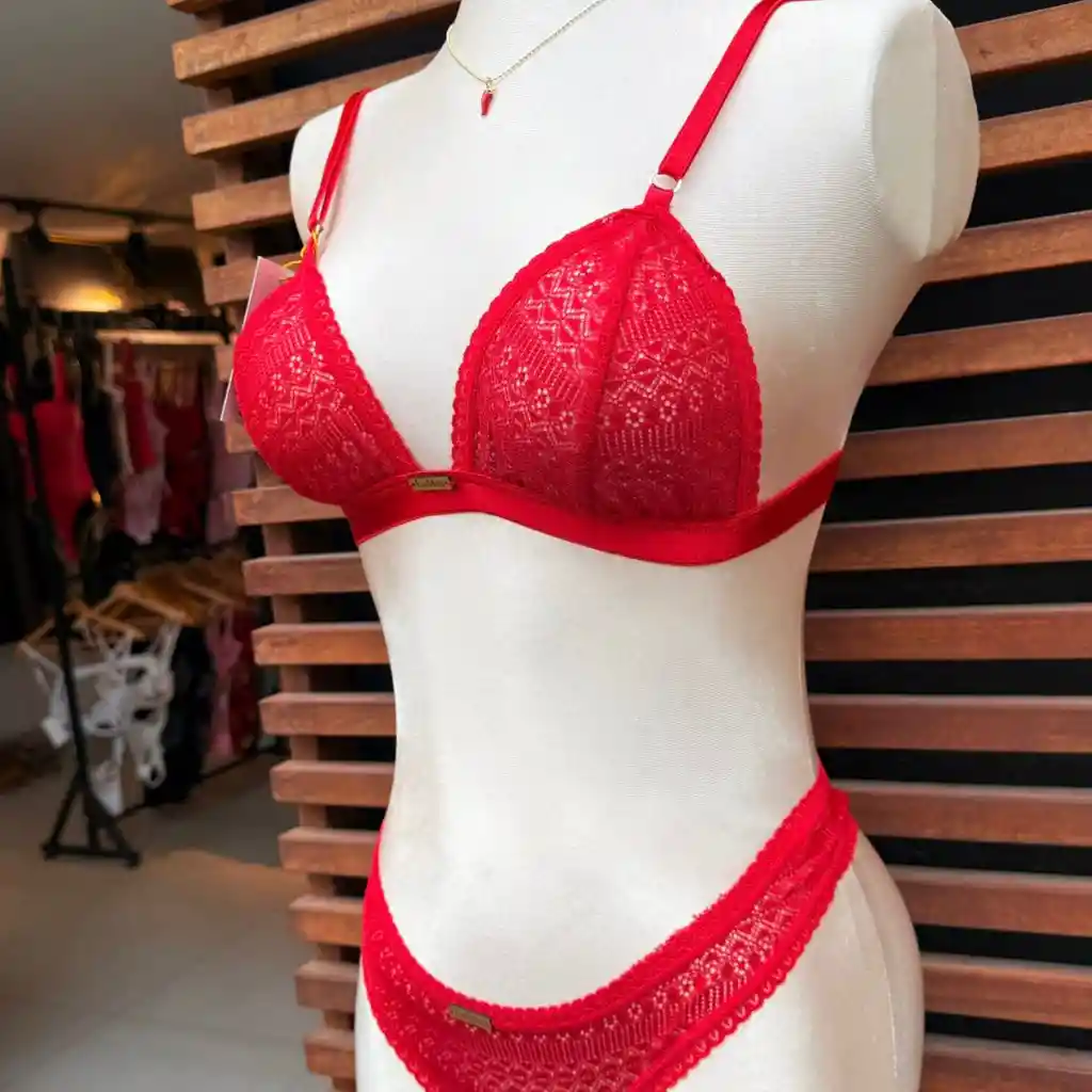 Conjunto de lencería tipo bralet sin varilla para una mejor horma, fabricado en encaje de la mejor calidad con panty color Rojo, fabricacion Nacional