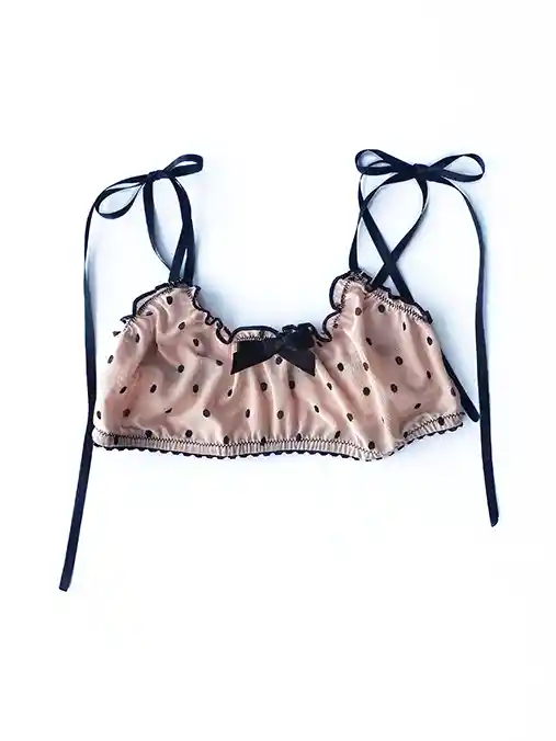 Rosado Con Puntos Negros, Fruncido Con Cintas en Los Hombros Que Se Pueden Desatar Para Ajustarse. No Tiene Gafete En La Espalda.
