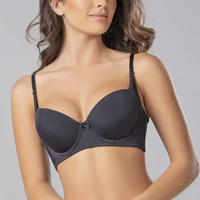 DETALLES Elaborado en microfibra. Diseño especial en sus laterales (aleta), que estimula el reconocimiento del busto y cubre las zonas del pliegue que se forman en la axila. Espalda ancha que permite mayor cubrimiento. Realce medio. TELA Microfibra premium de la más alta calidad, nylon y spandex. Diseñado y producido en Colombia.