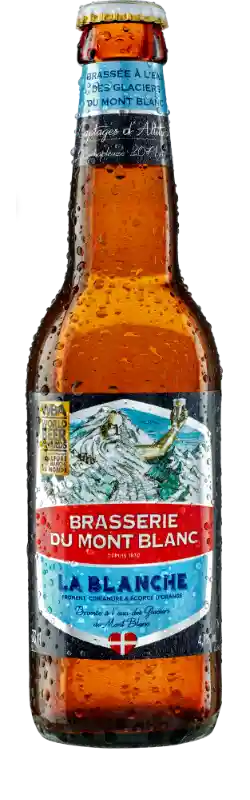 Brasserie du mont blanc la blanche 4,7% vol. Cerveza de trigo elegante, ligera, refrescante y ligeramente espumosa. La suavidad de las notas de trigo precede al frescor ácido y al sabor cítrico de la naranja, con una nota especiada final. Cerveza de trigo de tipo belga, procede de una mezcla de 3 cereales (malta de trigo, malta de cebada y avena) y lúpulos aromáticos, todo ello realzado por una piel de naranja sutilmente amarga y un toque de cilantro