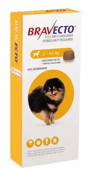 Bravecto es el antiparasitario revolucionario diseñado específicamente para perros que pesen entre 2 a 4.5 Kg. Su forma masticable y de suministro oral no solo es práctica, sino que proporciona una protección duradera contra las infestaciones de pulgas y garrapatas, manteniendo a tu fiel amigo seguro y feliz. Beneficios Clave de Bravecto Eliminación Efectiva de Parásitos: Su potente fórmula con Fluralaner actúa rápidamente sobre el sistema nervioso de pulgas y garrapatas, eliminándolas en poco tiempo. Protección Prolongada: Ofrece hasta 12 semanas de máxima defensa, minimizando la necesidad de tratamientos frecuentes. Fácil de Administrar: Con su alta palatabilidad, tu perro lo comerá voluntariamente, facilitando el proceso de suministro. Practicidad: A diferencia de las pipetas, su formulación oral es mucho más cómoda para ti y tu mascota. Prevención y Tratamiento: Efectivo tanto para la prevención como para el tratamiento de infestaciones actuales, manteniendo a tu perro protegido