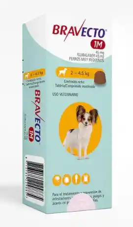 Bravecto 1 Mes es un comprimido masticable diseñado para perros que pesan entre 2 y 4.5 kg. Su principio activo, fluralaner, proporciona una protección efectiva contra pulgas y garrapatas durante 37 días con una sola dosis. Este tratamiento actúa rápidamente, eliminando pulgas en 2 horas y garrapatas en 12 horas tras la administración. Administración: Ofrezca el comprimido a su perro como una golosina; la mayoría de los perros lo aceptan voluntariamente debido a su sabor agradable. Si su perro no lo ingiere por sí solo, puede administrarlo junto con la comida o directamente en la boca. Asegúrese de que el perro haya ingerido completamente el comprimido.