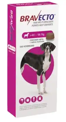 Protege a tu peludo de forma eficaz y duradera con Bravecto, el antiparasitario masticable de acción prolongada que elimina y previene infestaciones de pulgas y garrapatas por hasta 12 semanas con una sola dosis. Su fórmula avanzada actúa rápidamente, eliminando más del 98% de las pulgas en las primeras 12 horas y las garrapatas en menos de 24 horas, evitando así molestias, alergias y enfermedades transmitidas por estos parásitos. 💊 Presentación: Tableta masticable saborizada 🐶 Indicada para perros de: 40 a 56 kg ⏱️ Duración del efecto: 12 semanas (3 meses) ✅ Beneficios: Protección continua contra pulgas y garrapatas durante 3 meses. Tableta masticable y palatable, fácil de administrar. Resistente al baño y al agua, no pierde eficacia. Contribuye al control de dermatitis alérgica por picadura de pulga (DAPP). Ideal para perros grandes de todas las razas. ⚠️ Modo de uso: Administra una tableta por vía oral junto con el alimento o inmediatamente después de comer. Asegúrate de elegir la presentación adecuada según el peso de tu perro.