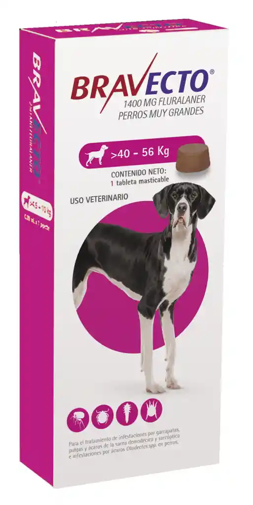 Bravecto es un antiparasitario de suministro oral y masticable para perros. Está formulado para tratar y prevenir las infestaciones de pulgas y garrapatas y su efecto empezará a actuar después de 2 horas de haber suministrado la tableta. Bravecto contiene Fluralaner un fuerte compuesto que actúa sobre el sistema nervioso de los artrópodos como las pulgas y las garrapatas eliminándolas eficientemente. Su efecto durará hasta 12 semanas, así que su perro tendrá máxima protección por mucho más tiempo.