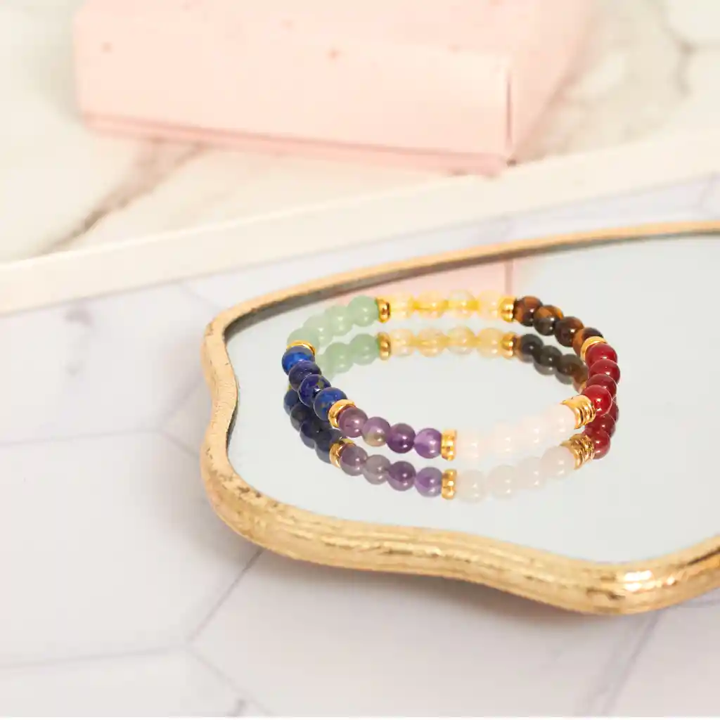 Los chakras son centros de energía inmensurables, situados en el cuerpo humano, desde la base de la columna hasta la corona de la cabeza. Poseen diferentes formas, colores, funciones y distintas frecuencias de vibración. Estos centros de energía vinculan el cuerpo físico con los cuerpos sutiles, por varias circunstancias los chakras se abren, expandiendo su energía divina en cada centro energético o se cierran y bloquean la energía, por ende, llevando siempre contigo este brazalete de chakras podrás armonizar y equilibrar tu energía. Brazalete ajustable para armonizar, equilibrar y proteger tus siete chakras principales. Cristales: cornalina, ojo de tigre, citrino, jade verde, lapislázuli, amatista y cuarzo cristal.