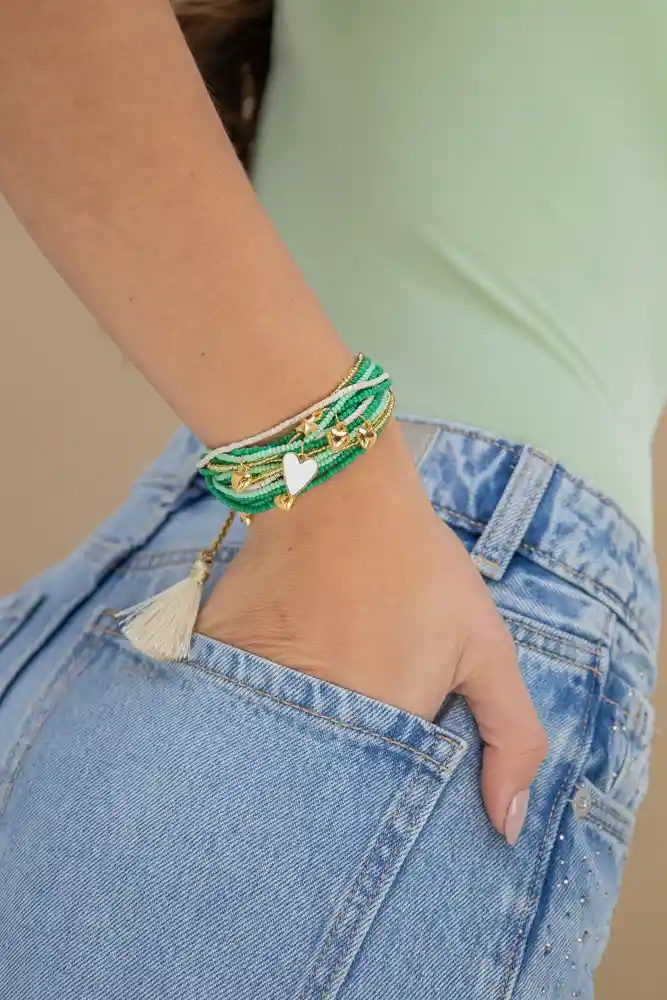 Pulsera tejida en mostacilla checa con nudo corredizo y borlas. Dijes y acabados en Oro Goldfilled Brasilero. Incluye: 1 brazalete verde combinado. Recibe con tu compra una FLORIBAG gratis, para que guardes por separado tus accesorios. Hecho a mano en Colombia. * Ten presente que algunas de las imágenes pueden estar ambientadas con otros productos que se venden por separado.