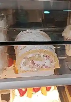 Porción de brazo de reina . Biscochuelo esponjoso relleno de crema, trozos de fresa y durazno
