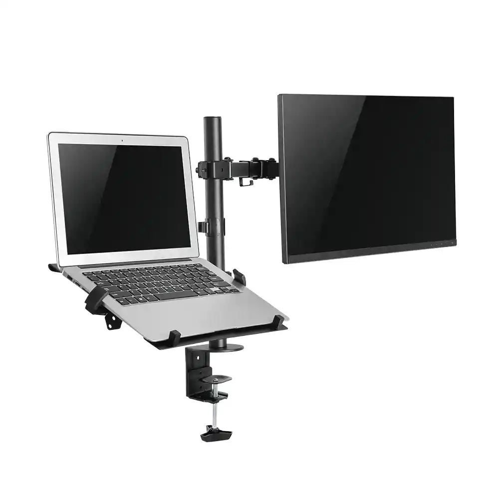 Para 1 portátil de hasta 15,6 pulgadas y 1 monitor entre 10″ y 27″. Soporta 1 monitor de hasta 7 kg y 1 portátil de hasta 4.5 kg. Tamaño plataforma para portátil de 30 cm de ancho x 28 cm de profundidad. El clip lateral retráctil se ajusta para adaptarse a cualquier computadora portátil con un ancho de hasta 42 centímetros. Topes inferiores de seguridad evita que su portátil se deslice. Cumple VESA 75×75 y 100×100. Altura ajustable máxima de 44 cms al centro de las pantallas. Extensión máxima hacia el frente: 40 cm Inclinación regulable entre -15° y +15°. Instalable en escritorios desde 1 cm hasta 9 cms de grosor (sistema de prensa o grommet) Fabricado en acero. Garantía de 12 meses por defectos de fábrica