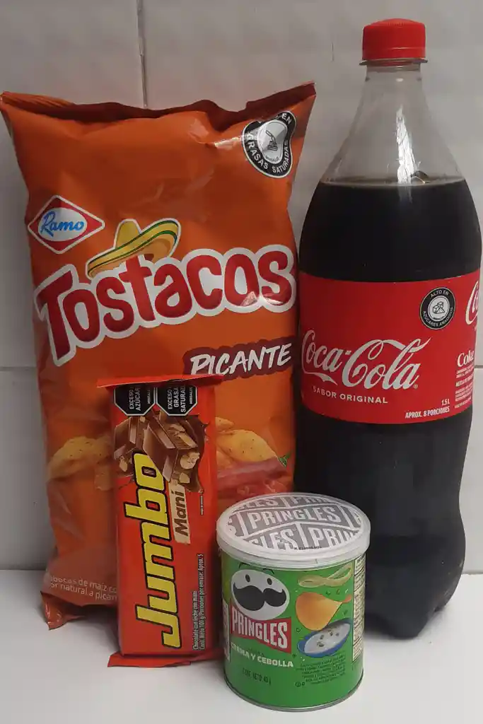Break para compartir trae *Coca-Cola 1.5 *Tostacos De Queso o Picantes Grandes *Papas Pringles Pequeñas *Chocolatina Jumbo Mani