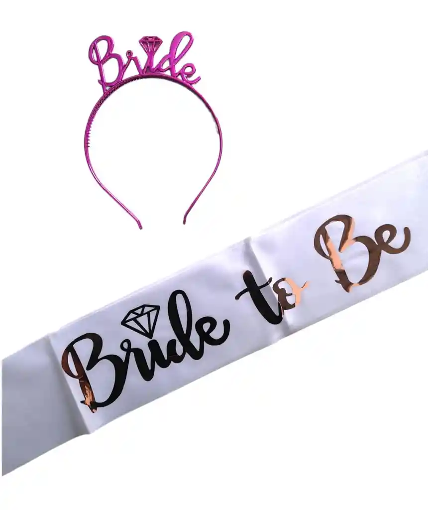 corona con palabra BRIDE en color FUCSIA Banda blanca con palabras Bride to be ORO ROSA Si deseas adicionar algo mas indicanos y con gusto te colaboramos