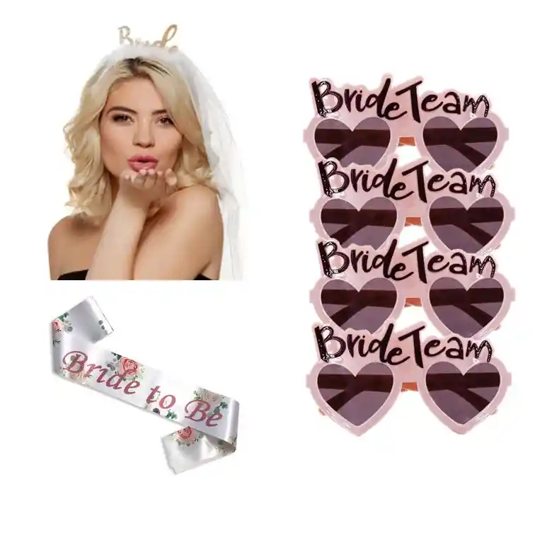 Espectacular kit para celebrar una fantástica despedía de soltera 1 tiara BRIDE con velo 1 Banda floral BRIDE TO BE 4 lentes rosa Bride Team Disponible para entrega inmediata Bogotá entregamos hoy mismo. somos de fiesta con lyly
