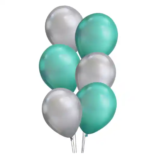 "Bouquet sencillo de 5 globos en helio. Incluye: - 3 globos plateados en látex - 3 globos verde esmeralda cromado en látex - Pesa sencilla Todos los globos contienen helio y gel de larga duración (3 días de duración). "