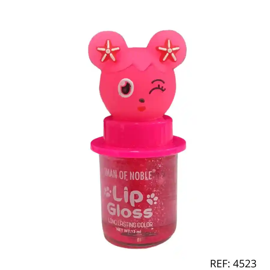 Brillo labial infantil con tapa de osito, aroma frutal y glitter. Presentación divertida de 13 ml.