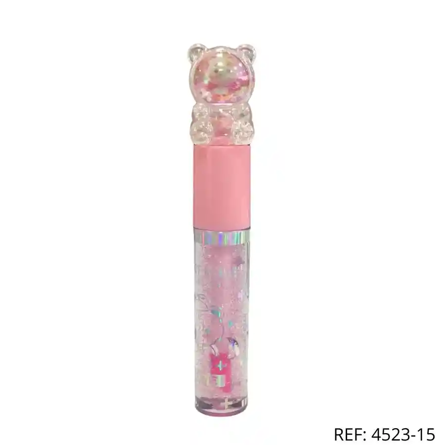 Brillo labial con glitter y tapa de osito brillante. Aroma frutal, ideal para niñas. ¡Tierno, colorido y divertido!