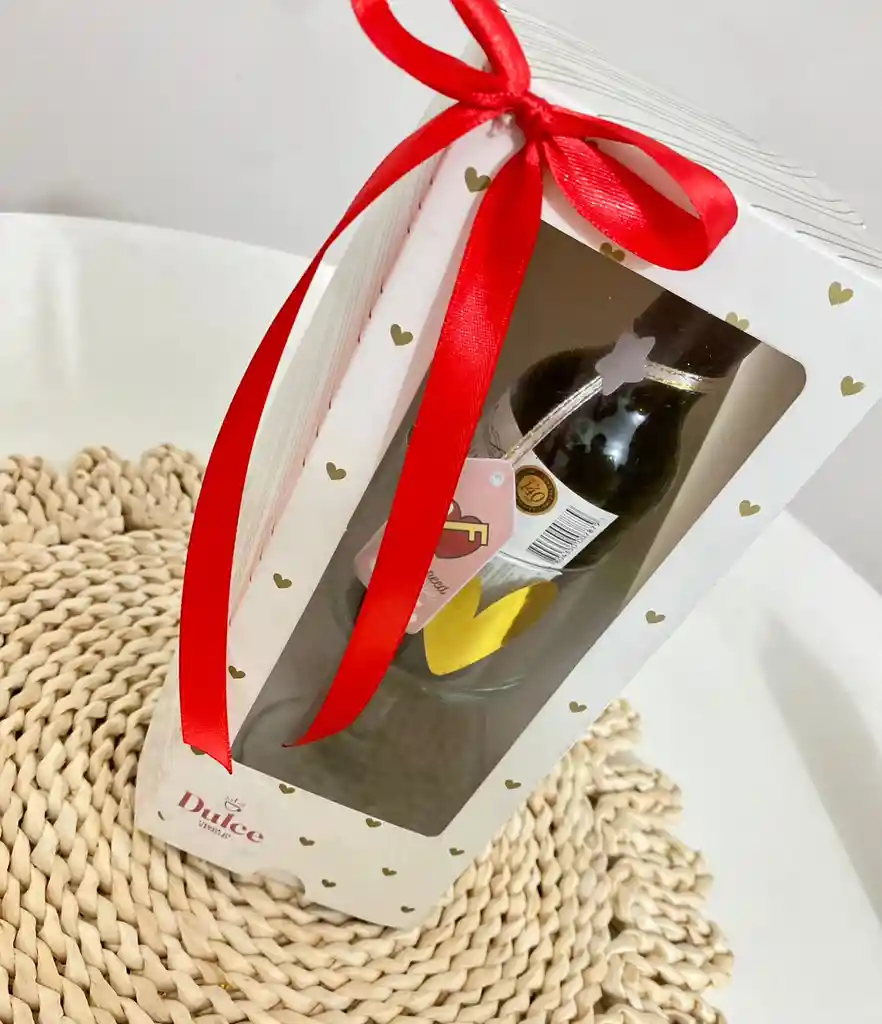 Cajita de lujo, con vino de 187 ml, con copa de cristal y tarjeta san valentin.