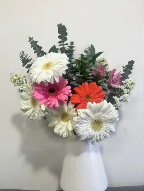 6 gerberas + 2 astromelias + eucalipto + follaje Incluye jarrón (puede variar sujeto a disponibilidad)
