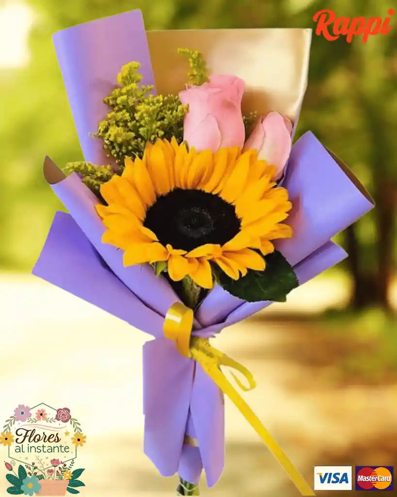 Un bouquet elegante y lleno de luz. Envuelto en un sofisticado papel coreano, este arreglo combina la energía de 1 girasol con la delicadeza de 3 rosas del color de tu elección. El toque final lo pone el sutil sólidago amarillo, creando una composición armoniosa y vibrante.
