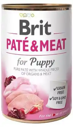 Brit Paté Meat Puppy es un alimento húmedo en lata indicado para cachorros y perros jóvenes. Formulado con 70% de pollo y pavo + paté puro de carne. Enriquecido con aceite de salmón como fuente de Omega 3. Libre de soya, GMO y gluten.