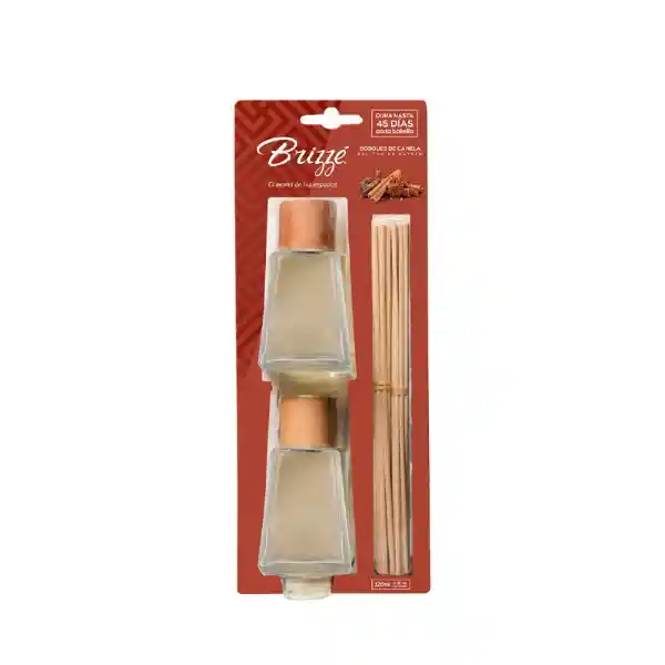 Un particular ambientador de palitos de rattan con aroma a bosques de canela de la marca Brizzé de atractivo diseño, que consiste en un recipiente de aceite aromático que utiliza varias varitas que absorben el aceite a través de sus poros para propagar una encantadora fragancia a campos de canela que se propagará por los espacios para mejorar el ambiente, para lo cual se vale también de su estructura ornamental y vanguardista que proyecta sofisticación y elegancia