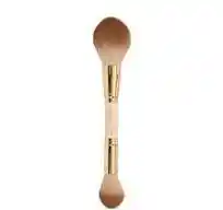 Brocha doble de fibras sintéticas, 100% veganas y libres de crueldad. Su forma en gota se adapta al rostro: El extremo grande cubre amplias, ideal para polvos y rubor