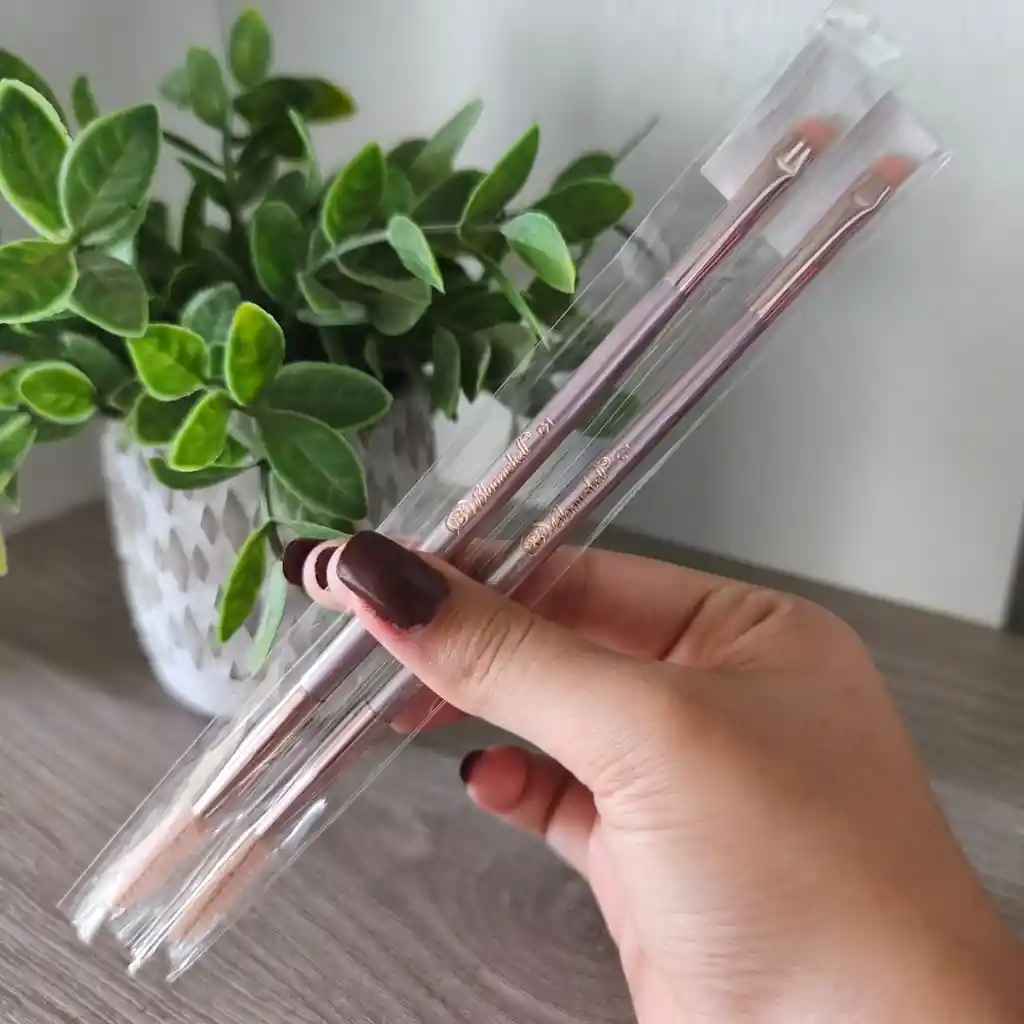 Brocha plana y angulada con fibras sintéticas y suaves que aplica color en las cejas con gran precisión, trae un cepillo para peinar y difuminar.