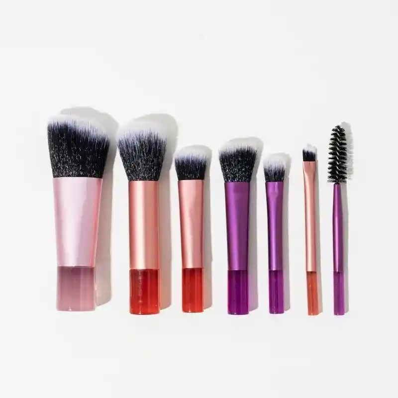 kit viajero con 7 brochas pequeñas Brocha mofeta viselada para contorno Brocha para polvo Brocha chata para base liquida Brocha para rubor Brocha para sombras Brocha viselada para cejas Spooling para peinar cejas y pestañas