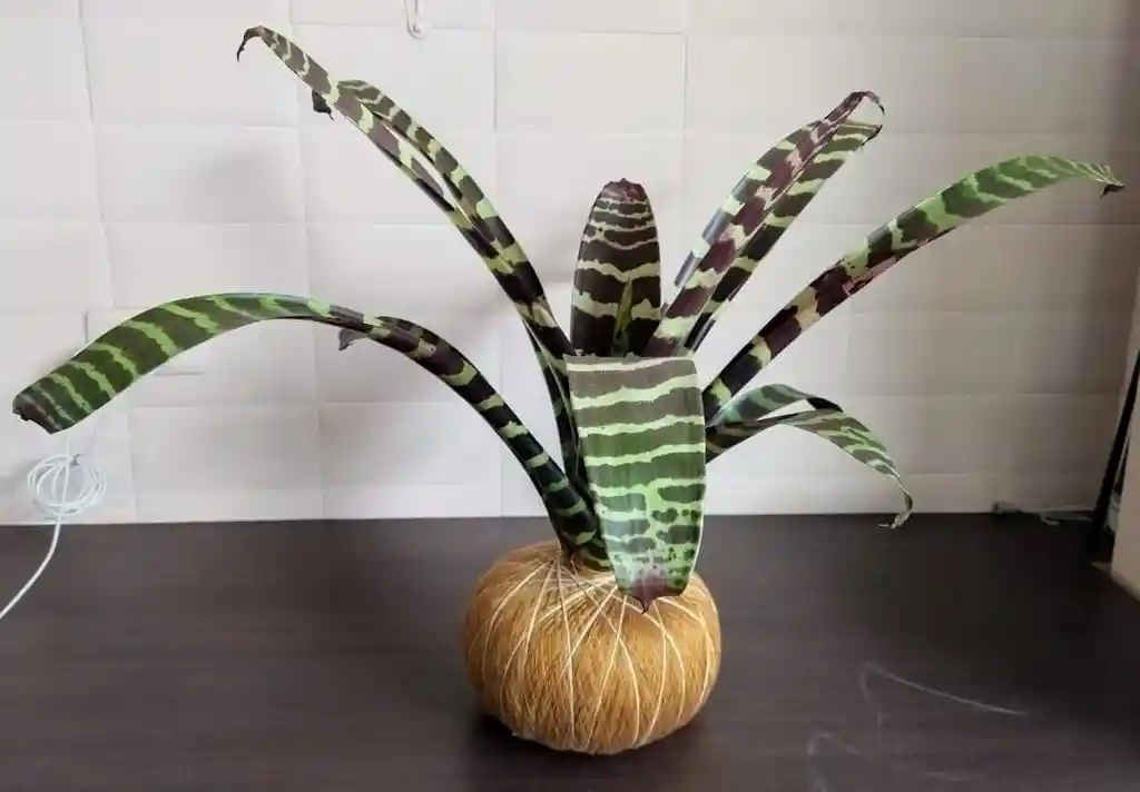 Plantas Bromelias. Son plantas exóticas ensambladas en una técnica Japonesa de nombre Kokedama. Las Bromelias son plantas de interior con buena luz , preferiblemente no sol directo, aunque adaptándose en el tiempo pueden recibirlo de la tarde cuando baje la intensidad. Se debe hidratar colocando agua fresca en la parte central de la planta...formando un espejo de agua, cada 8dias. Como el agua queda aposada, cada vez que se hidrate nuevamente se desecha esa agua y se coloca una nueva...es similar al cambio periódico de agua en un florero. Favor hidratarlas bien temprano en la mañana o bien en la tardecita, no en medios dias calurosos. El coco se puede sumergir cada 30 dias en agua para hidratarlo en un balde con agua durante 10 minutos. Cada 15 dias se puede hidratar las hojas con un spray y agua fresca rociandolas. Limpiarles las hojas de polvo periódicamente con un pañito húmedo con agua les sienta bien. Se recomienda hidratar las plantas después de las 5:30 PM en adelante Gracias por llevar Vida Verde a Tu Hogar!! La flor de la bromelia puede tener un tiempo de duración de 4 a 6 meses de vida, la flor de esta bromelia tinene la forma de una vara cuando esta pequeña y con el paso de el tiempo va creciendo y su color cambia a rojo.