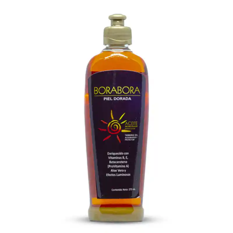 Bronceador Bora Bora Piel Dorada (Contiene 275ml)Aceite bronceador intenso / Dark. enriquecido Aceite bronceador intenso / Dark. enriquecido con vitaminas B.E. Betacaroteno (Provitamina A). aloe vera. efectos luminosos. Modo De Empleo Agitarse antes de cada aplicación. renovar aplicaciones uniformemente para que cubra toda la piel. Hidratar la piel con agua en el tiempo de exposición al sol. cambiar de posición cada cierto tiempo para evitar la insolación. Resultados en una hora. (Usar protector solar para mantener siempre la piel hidratada.) Precaución Tomar el sol en horarios recomendados antes de las 11 a.m y después de las 2:30 p.m. No aplicar jabones después de la exposición al sol para evitar enrojecimiento y resequedad de la piel. preferiblemente después de la exposición al sol hidratar con crema y/o aceites de almendras. Si observa una reacción desfavorable suspenda su uso. Uso externo. evite el contacto con los ojos. mantenga fuera del alcance de los niños. Conserve bien tapado. Mantenga en un lugar fresco y protegido de la luz directa. alejado del fuego y del calor excesivo. Después de abierto 18 meses de uso. Tips para un mejor bronceado El mejor horario para tomar el sol es antes de las 11 a.m y después de las 2:30 p.m Consumir jugo de zanahoria ayuda a tener un mejor bronceado Exfoliar la piel antes de tomar el sol para que así dure mas el color Hidratar la piel después de tomar el sol. esto ayuda a mantener la piel mas suave y a que dure mas el bronceado