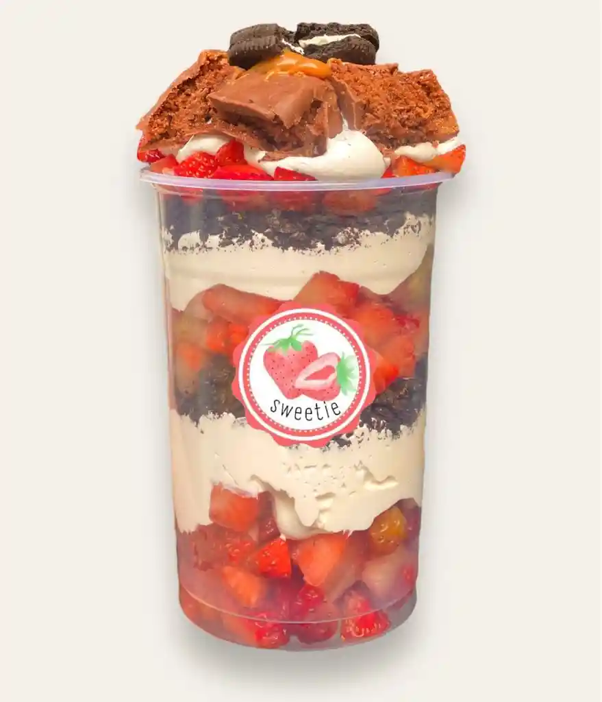 Fresas con crema grande, oreo triturada, brownie y arequipe.
