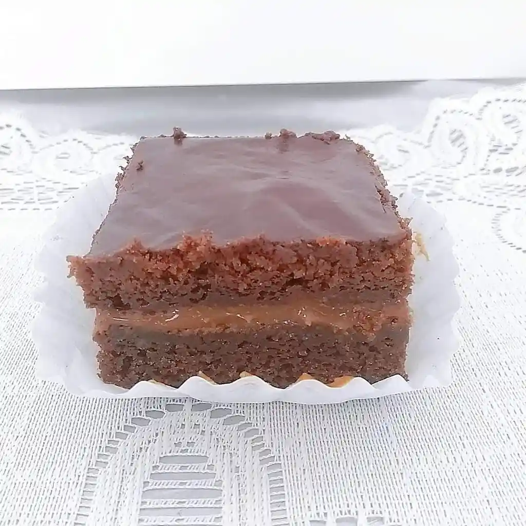 brownie casero relleno con arequipe cubierto con ganache de chocolate