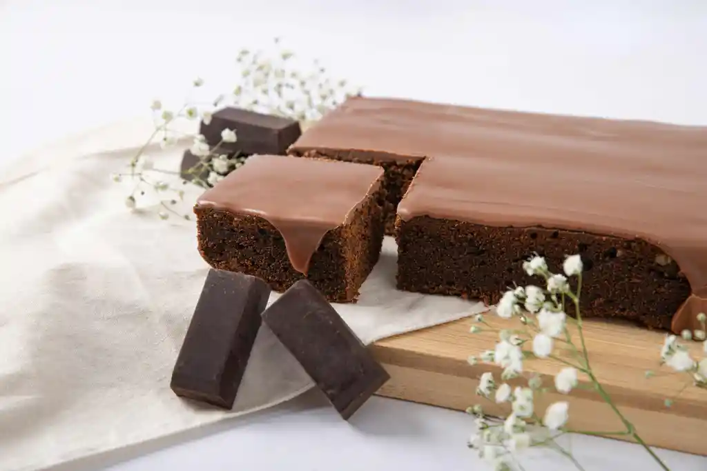 Bizcocho de chocolate, cubierto con salsa de chocolate crujiente por arriba y tierno en su internos, sin azúcar. Presentación en caja para 6 porciones