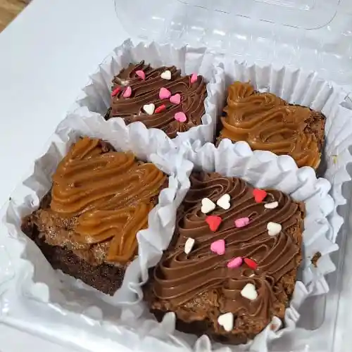 Brownie melcochudo (viene por 4 porciones pequeñas) acompañado de tu topping favorito. (nutella o arequipe) presentado en una caja o empaque, listo para regalar o dar un detalle especial
