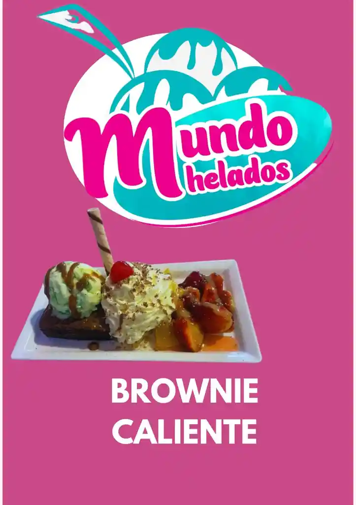 brownie caliente con un sabor de helado trozos de duraznos, fresas crema chantilly cereza barquillo