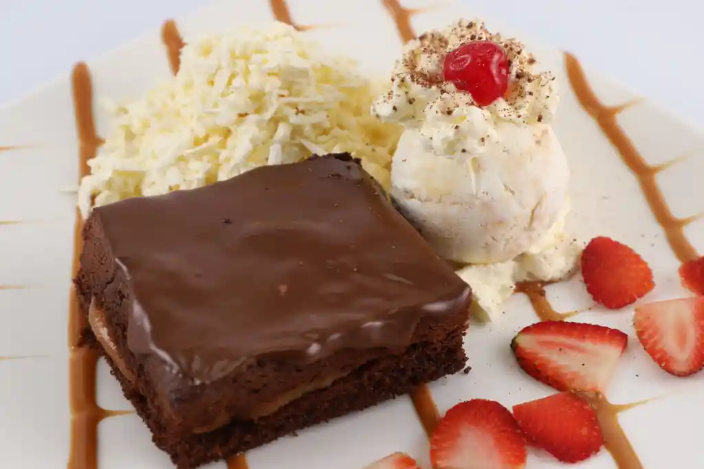 Un sabor de helado acompañado de Brownie (frio/caliente), queso, chantilly, fresas y salsa de arequipe.