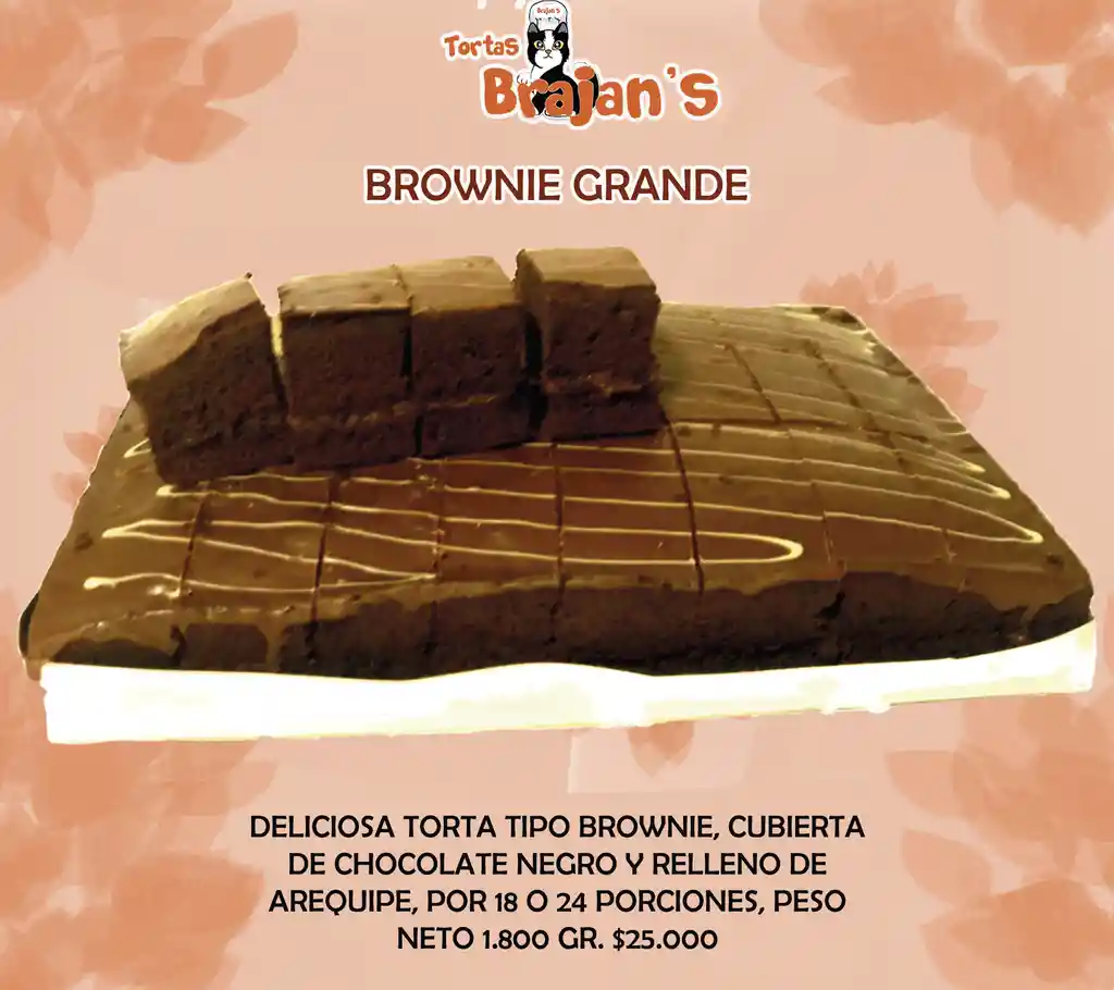 Deliciosa torta tipo brownie, cubierta de chocolate negro y relleno de arequipe, por 18 o 24 porciones, peso neto 1.800 gr.