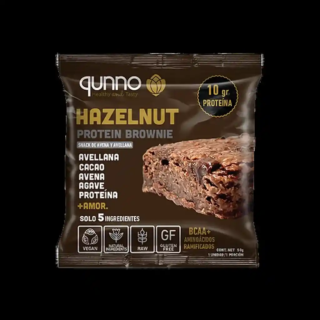 Ingredientes: avena, crema de avellana, cacao en polvo (70%), proteína aislada de arveja y miel de agave, ofreciendo 10g de proteína por porción, siendo sin gluten, vegano y con BCAAs, ideal para un snack saludable.