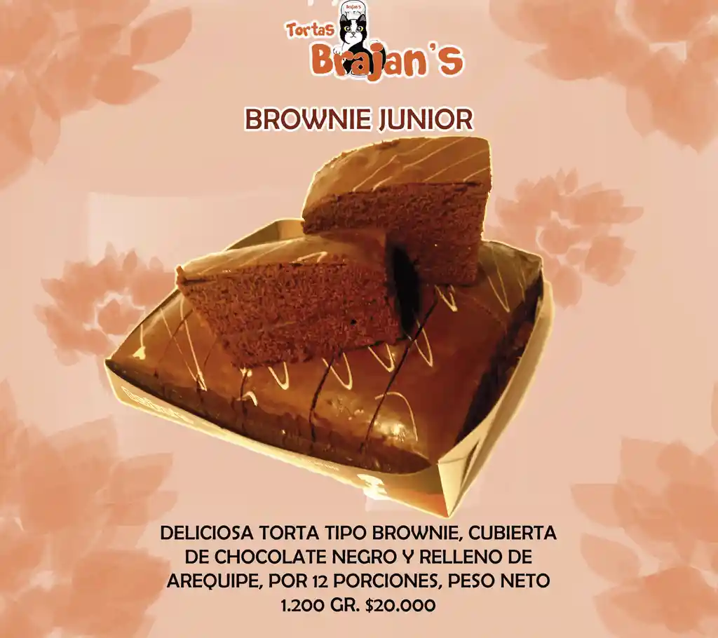Deliciosa torta tipo brownie, cubierta de chocolate negro y relleno de arequipe, por 12 porciones, peso neto 1.200 gr.